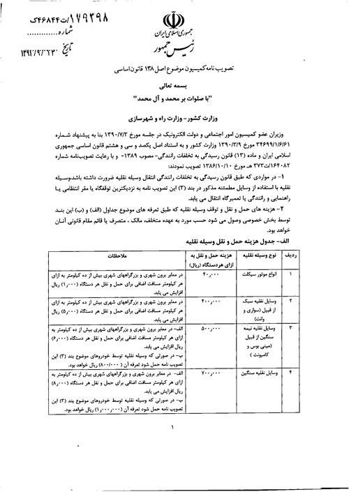 جدول هزینه های حمل و نقل وسایل نقلیه