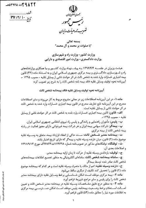 تصویر آیین نامه نحوه توقیف وسایل نقلیه فاقد بیمه نامه شخص ثالث