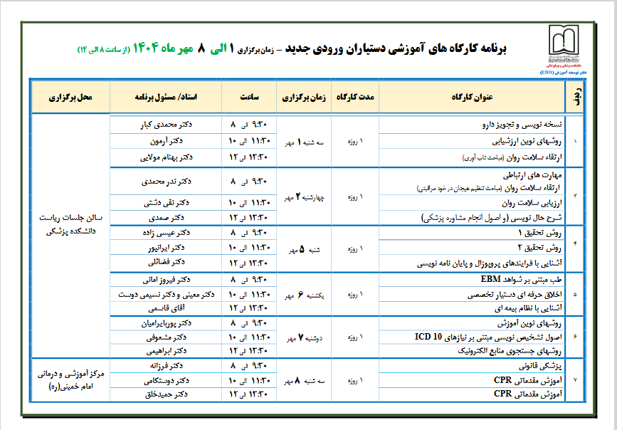 کارگاه های آموزشی دستیاران ورودی جدید(۱۴۰۴) تعداد بازدید:۳۵ ارسال به دیگران نام شما ایمیل شما ایمیل دریافتکننده ارسال انصراف کارگاه های آموزشی دستیاران ورودی جدید(1404) طبق برنامه پیوستی از مورخه 1 مهر تا 8 مهر 1404 در دانشکده پزشکی و مرکز آموزشی و درمانی امام خمینی(ره) برگزار خواهد شد.