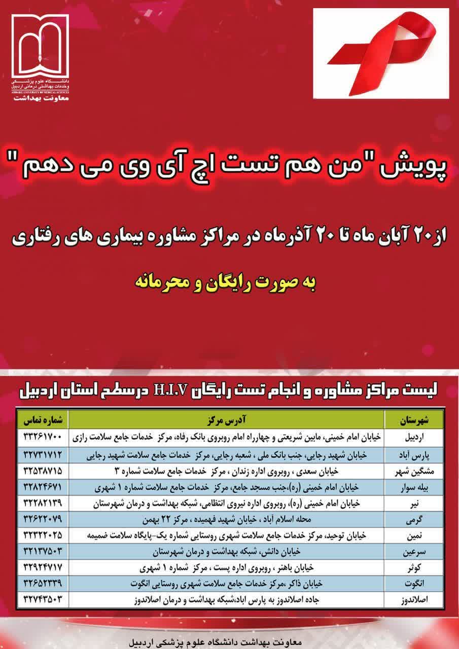 اطّلاع رسانی پویش ملّی «من هم تست HIV می دهم» به انضمام محتوای آموزشی مرتبط ( کتابچه رویکرد نوین آموزش ،نمونه پیام کوتاه بهداشتی ، لیست مراکز مشاوره و انجام تست رایگان